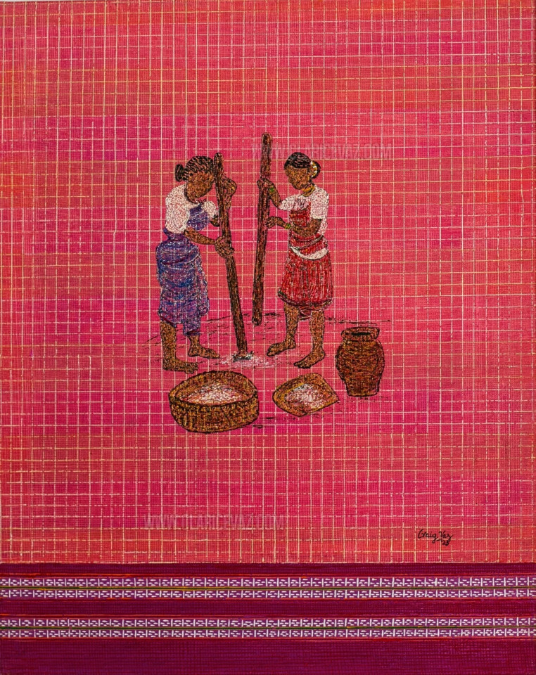After years of experimentation, I have successfully recreated the crisscrossing of the horizontal/vertical strands of ‘thread’ at right angles aesthetically forming intricate block patterns of the body of the fabric on canvas. For this I use acrylic paste. This ‘Kunbi Weave’ and decorative borders allow me to reinterpret the essence of our ancient Goan legacy. Currently, I am exploring the Azulejo style, a Portuguese art form, that can be seen in our land which basks in its western influences through its history.